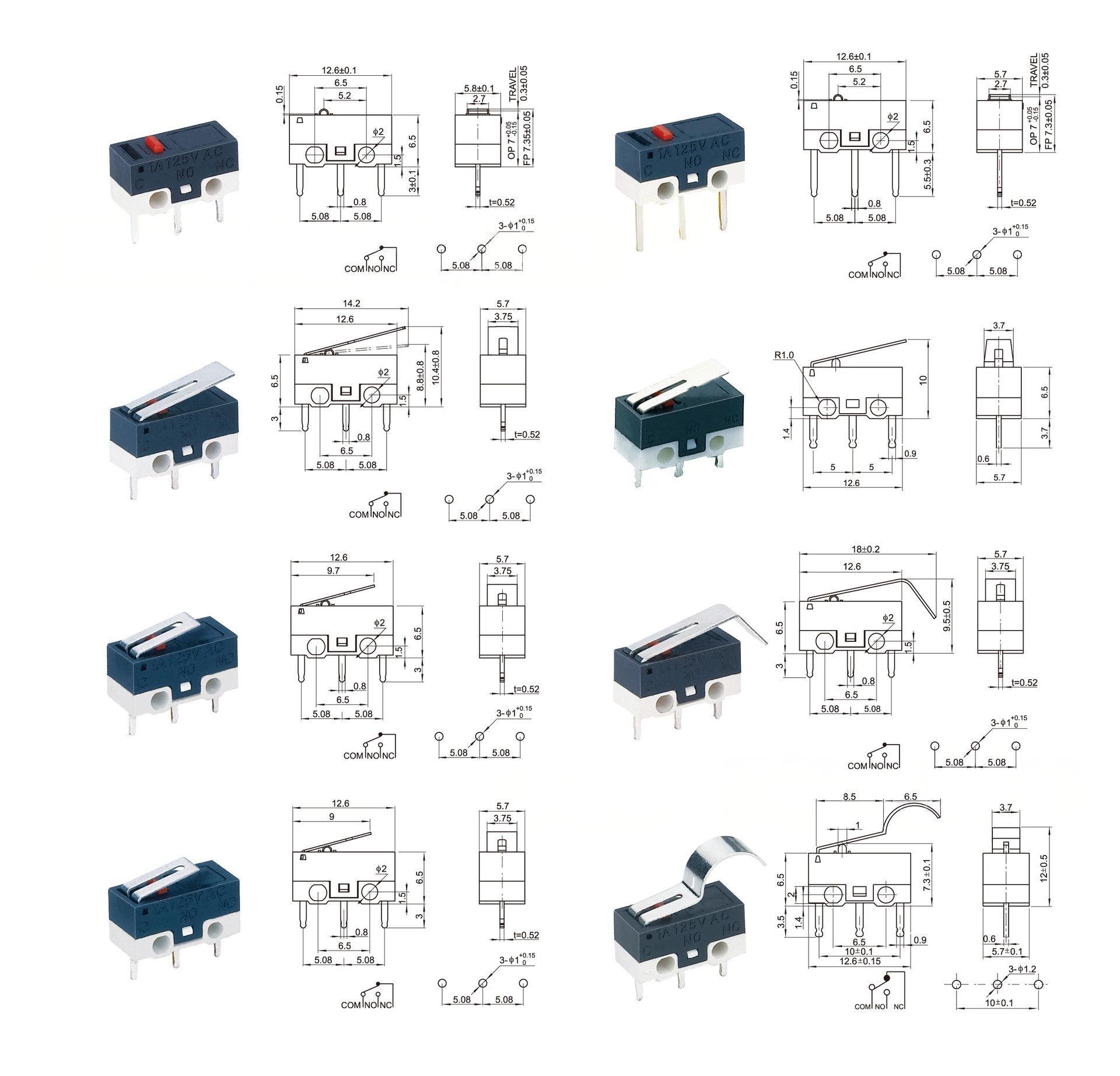 특허받은 스냅액션 퀵 트리거 메커니즘을 사용하면 트리거 응답 시간이 8ms 이하로 기존 마이크로 스위치에 비해 성능이 25% 향상됩니다. 트리거 이동 거리는 0.3~1.0mm 사이에서 정밀하게 제어되며 작동력 범위는 1.5~4N입니다. 누르는 피드백은 눌려지거나 자유로운 플레이 없이 명확하고 선명하여 '가벼운 터치 연결, 해제 후 끊기'를 정밀하게 제어할 수 있어 높은 트리거 감도가 필요한 시나리오에 완벽하게 적합합니다. 접점은 고순도 은-주석 합금으로 만들어지고 정밀한 스폿 용접으로 처리되며 초기 접점 저항은 30mΩ 이하입니다. 정격 부하는 1A/250V AC 및 3A/125V AC를 지원하여 전류가 흐를 때 접점 가열 또는 연소를 효과적으로 방지합니다.