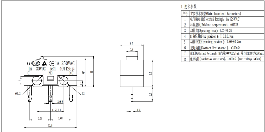특허받은 스냅액션 퀵 트리거 메커니즘을 사용하면 트리거 응답 시간이 8ms 이하로 기존 마이크로 스위치에 비해 성능이 25% 향상됩니다. 트리거 이동 거리는 0.3~1.0mm 사이에서 정밀하게 제어되며 작동력 범위는 1.5~4N입니다. 누르는 피드백은 눌려지거나 자유로운 플레이 없이 명확하고 선명하여 '가벼운 터치 연결, 해제 후 끊기'를 정밀하게 제어할 수 있어 높은 트리거 감도가 필요한 시나리오에 완벽하게 적합합니다. 접점은 고순도 은-주석 합금으로 만들어지고 정밀한 스폿 용접으로 처리되며 초기 접점 저항은 30mΩ 이하입니다. 정격 부하는 1A/250V AC 및 3A/125V AC를 지원하여 전류가 흐를 때 접점 가열 또는 연소를 효과적으로 방지합니다.