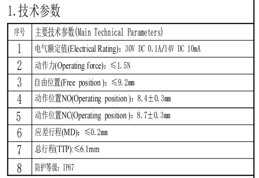 | 1 | 전기 등급 | 10MA 14V DC/0.1A 30VDC | |
